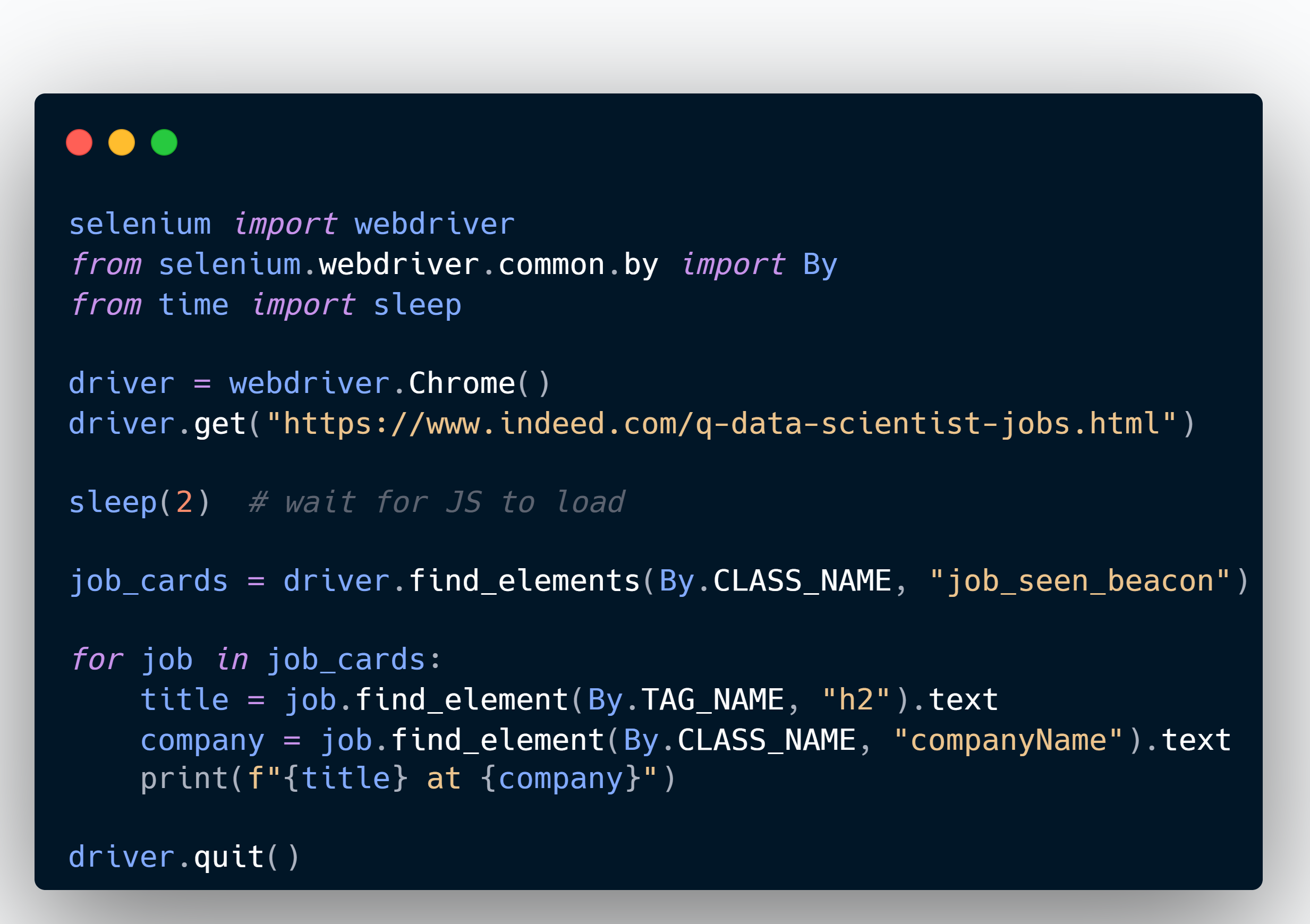 Selenium automates your browser. If a site relies heavily on JavaScript, it can load the full page, click buttons, scroll down, and extract whatever is on screen. That’s perfect for modern job boards.